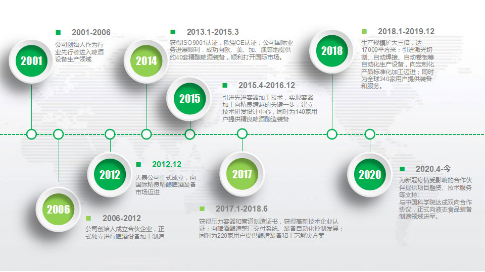 公司團隊始于2001年,至今有19年的行業經驗,也見證了行業的飛速發展。公司成立于2012年,之后便是精釀啤酒市場的蓬勃發展時期,我們一致力于精釀啤酒項目工藝多樣化、裝備定制化、操控自動化、管理數據化的研發和積累。到目前,天泰公司己向全球76個國家和地區超過1300家啤酒廠提供全套的設備及工藝解決方案,并取得良好口碑。2020年山東天泰與中國科學院微生物研究所簽訂技術合作協議,雙方共建“中科天泰液態酒聯合創新研發中心“。