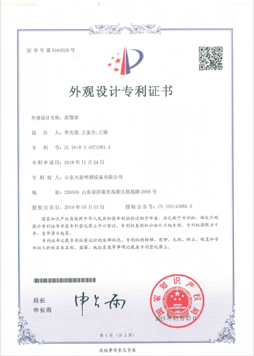 您的位置: 首頁 > 關于天泰 > 專利證書